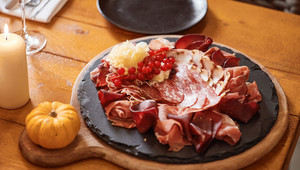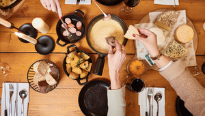 - Französisches Käsefondue zum Teilen; serviert mit Rauchwurst, Aufschnitt, Kartoffeln und Blattsalat, dazu Brot und Butter