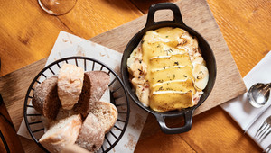 - Authentische Tartiflette zum Teilen, dazu Beilagen: frischer grüner Blattsalat mit Vinaigrette, Käseplatte & Brezeln
