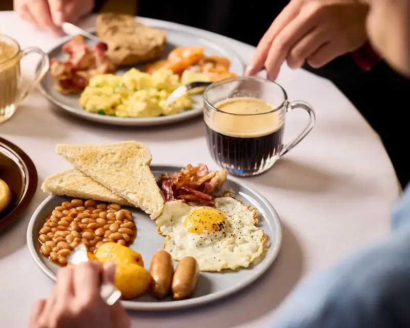 Een uitgebreid ontbijtbuffet met vers afgebakken brood, heerlijke vlees- en kaassoorten, klassieke Engelse ontbijtgerechten en frisse fruitsalades. Daarbij serveren we koffie, thee, melk, verse sappen en smoothies. Voor een feestelijk begin staat er een glaasje cava voor u klaar.