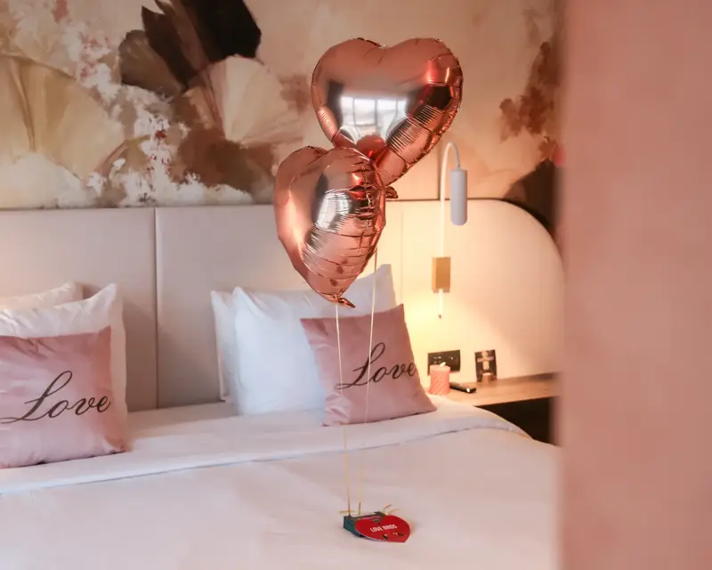 Laissez-vous transporter dans un monde d'amour et d'élégance en séjournant dans notre Suite Saint-Valentin exclusive. Cette suite à l'atmosphère feutrée est idéale pour une escapade romantique. Ses tons doux, son éclairage chaleureux et ses détails raffinés créent une ambiance parfaite pour la Saint-Valentin. À votre arrivée, une gourmandise chocolatée vous attendra dans votre chambre pour rendre votre séjour encore plus spécial. Profitez d'une détente absolue à deux dans un cadre luxueux. La salle de bain moderne est équipée d'une spacieuse douche à effet pluie et d'une baignoire confortable, idéale pour se relaxer et partager des moments privilégiés.
