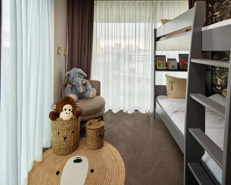 Notre suite familiale de luxe est composée de trois espaces différents, dont un espace pour les enfants avec des lits superposés.