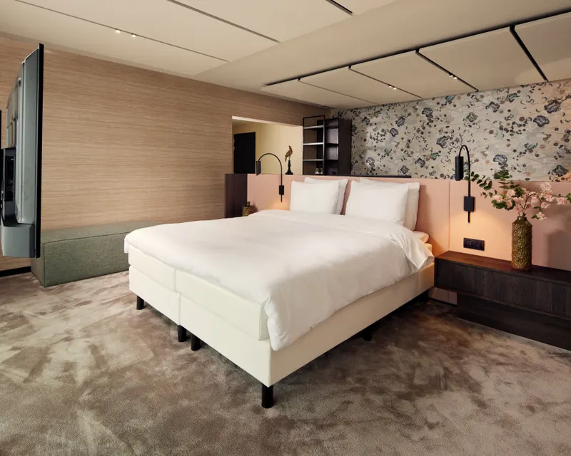 Cette suite se compose de 3 chambres communicantes et offre une vue panoramique sur la ville de Gand. Le design unique garantit une expérience inoubliable.